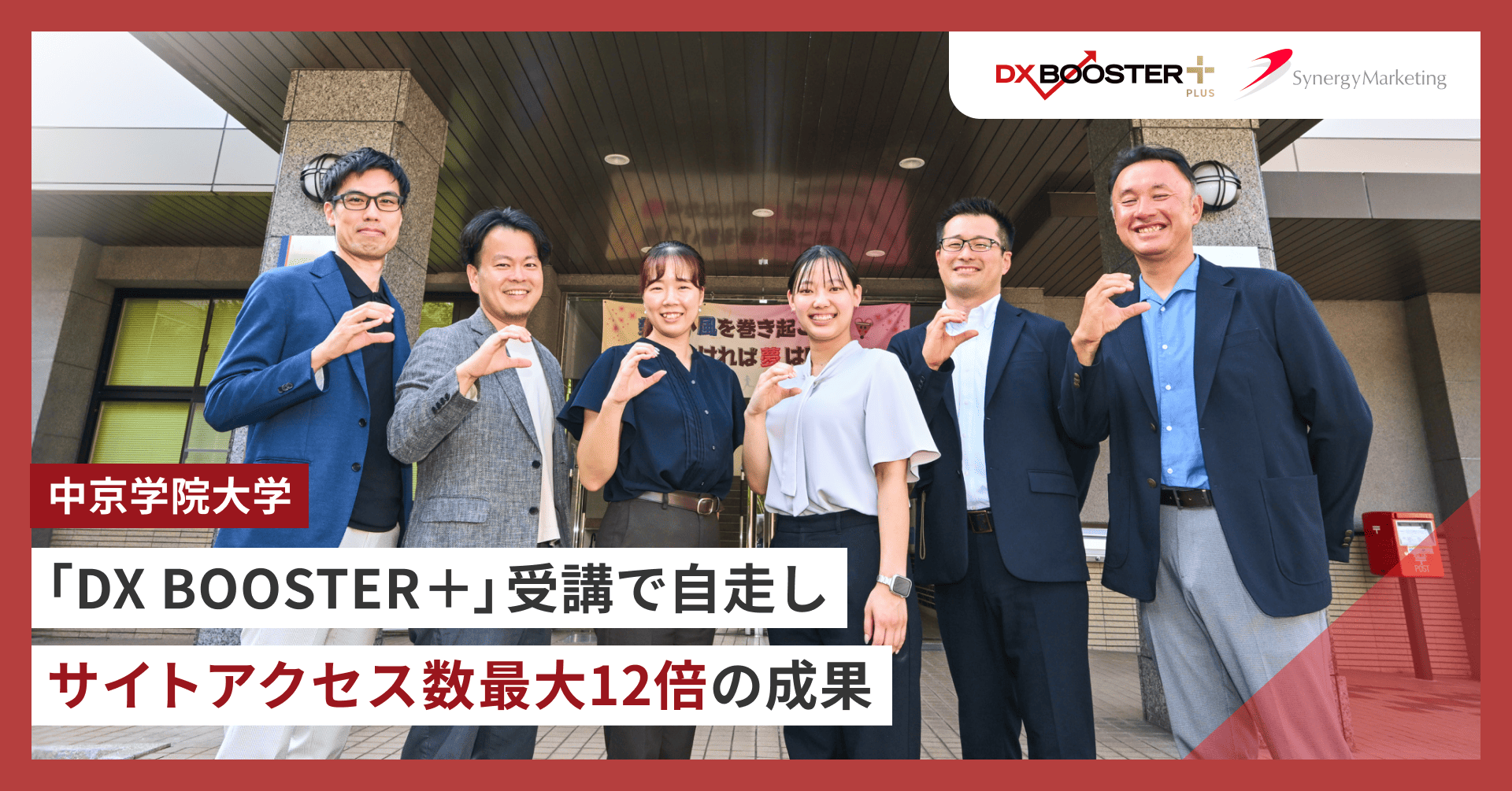 シナジーマーケティング株式会社(所在地:大阪市北区、代表:奥平 博史、以下:当社)は、学校法人中京学院 中京学院大学(所在地:岐阜県学長:林 勇人、以下:中京学院大学)に対し、当社の併走型マーケティング人材育成プログラム「DX BOOSTER+(ディーエックスブースタープラス)」を提供しました。本プログラムを通じて、マーケティング未経験のスタッフが「顧客視点での考え方」と、Web上の数字を読み解き「自ら考え答えを出す」力を身に付け、大学公式サイトの改善やSNS活用によってサイトアクセス数を最大12倍に増加、旧サイト比較で約2倍の流入数(同期間比較)といった成果を実現しました。