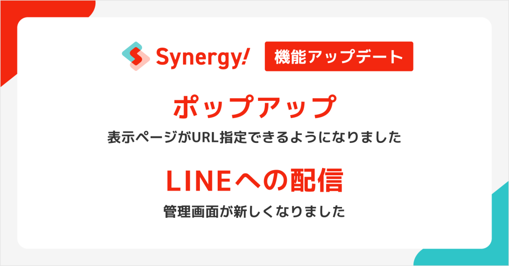 CRMから進化したマーケティングSaaS「Synergy!」を提供するシナジーマーケティング株式会社(所在地:大阪市北区、代表:奥平 博史、以下:当社)は、2025年11月より、Webサイト訪問者へのアプローチを強化する「ポップアップ機能」のアップデートと、「LINEへの配信機能」 の強化を実施したことをお知らせします。