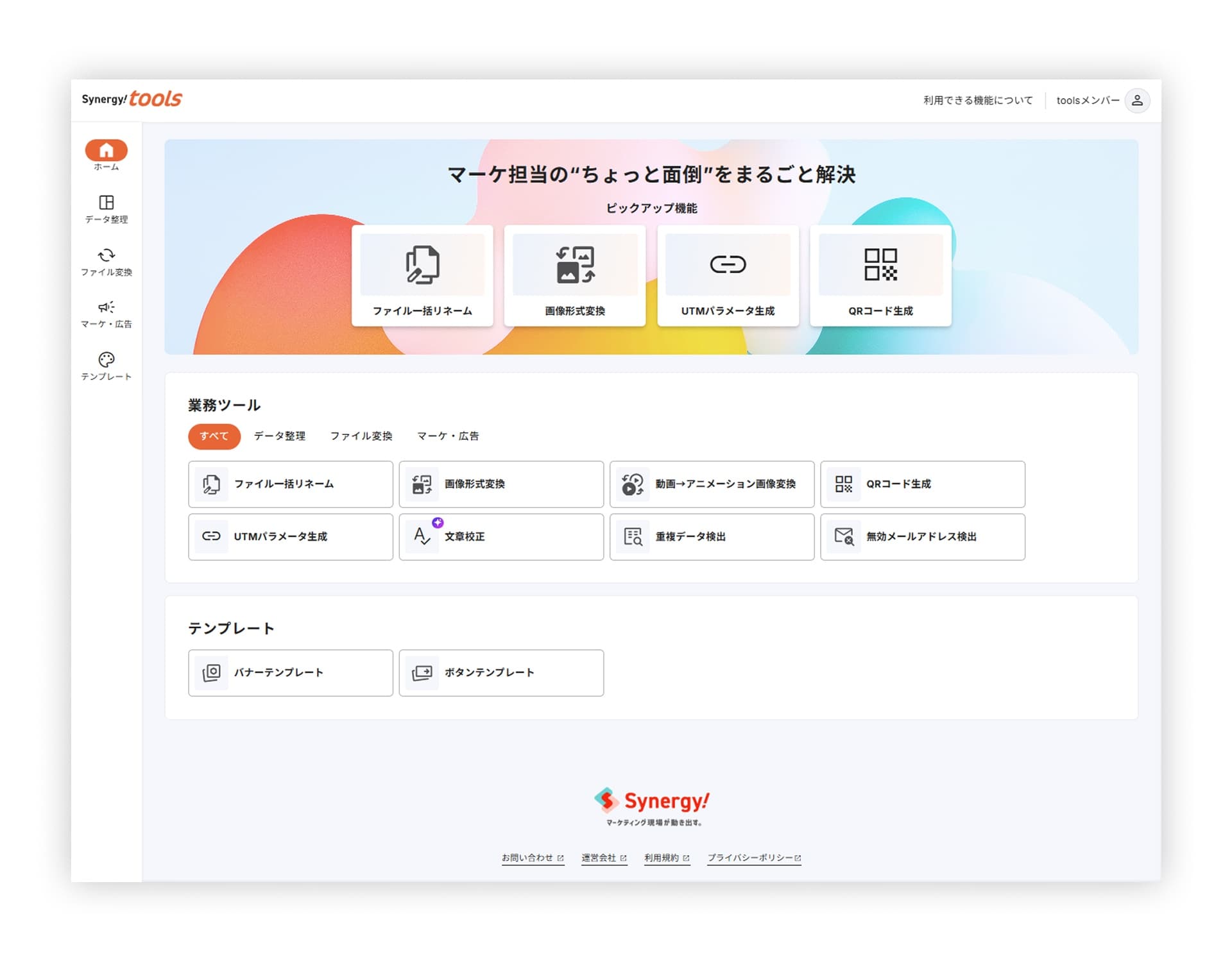 『Synergy! tools』は、複数の専門ツールを切り替える煩わしさを解消し、ひとつのサイトで効率的に作業ができる多機能なツール集です。マーケティング業務を行う中で、ひとつひとつは小さいけれど意外と面倒で手間のかかる周辺作業を、効率的にまるごと解決してくれます。